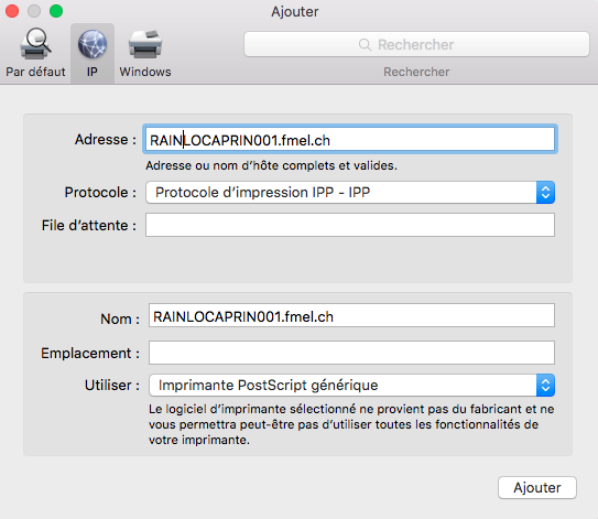 Enter the printer address in the "Address" field, and when you have finished, the following fields will be filled in automatically.
